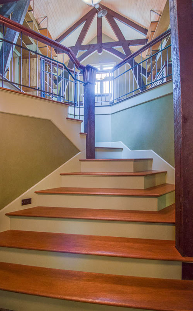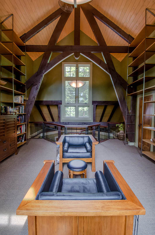 Combining unique finishes, textures, repurposed antique building components, carvings and furnishings inside, and a blend of stone, wood, and steel on the exterior, this unique home became a one of a kind post and beam masterpiece. Architectural features include field-built timber trusses in the vaulted library and a unique four-post bed in the master bedroom suite that actually supports the structural roof.