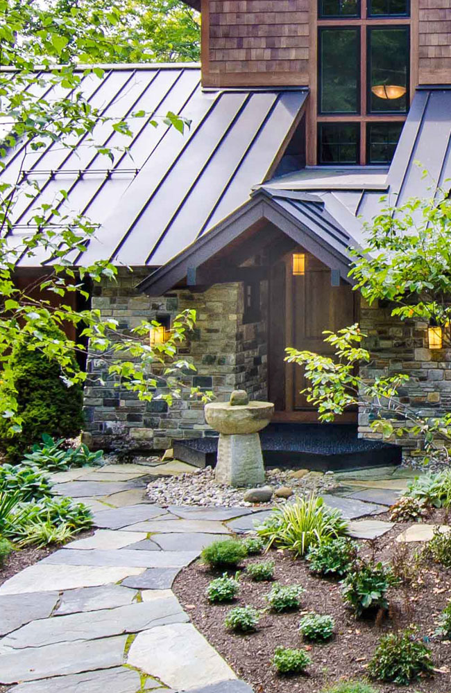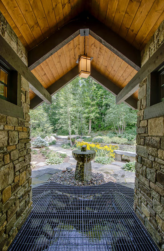 You are welcomed to the recessed stone entrance by a stone water fountain that was carved on-site. An open steel grated landing creates a waterfall descending to an open "grotto" below. Natural stone walks and retaining walls, along with extensive landscape plantings, create an inviting access to the entrance and present a private but visible, perspective from the mountain road leading to the home.